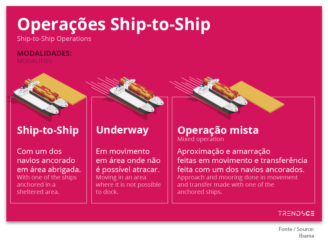 As operações de transbordo pertencem a uma modalidade conhecida como “Ship-to-Ship” (STS) que, segundo o Ibama, consiste na transferência de carga de petróleo e seus derivados entre embarcações localizadas em águas jurisdicionais brasileiras, podendo ocorrer com as embarcações em movimento ou ancoradas. “Essa modalidade, normalmente, é realizada através da transferência de carga entre dois ou mais navios, onde o primeiro, geralmente um navio de grande porte, que não atraca em portos pequenos, atraca no berço e o segundo, um navio menor que tem condições de atracar em portos pequenos, atraca a contrabordo do primeiro. Após a atracação, é realizada a conexão através de mangotes, que são uma espécie de mangueira, por onde o combustível é bombeado do navio 1 para o 2. Finalizada essa operação, o navio 2 desatraca e o navio 3 atraca e recebe o restante do combustível”, explica o diretor executivo de operações do Porto do Pecém.