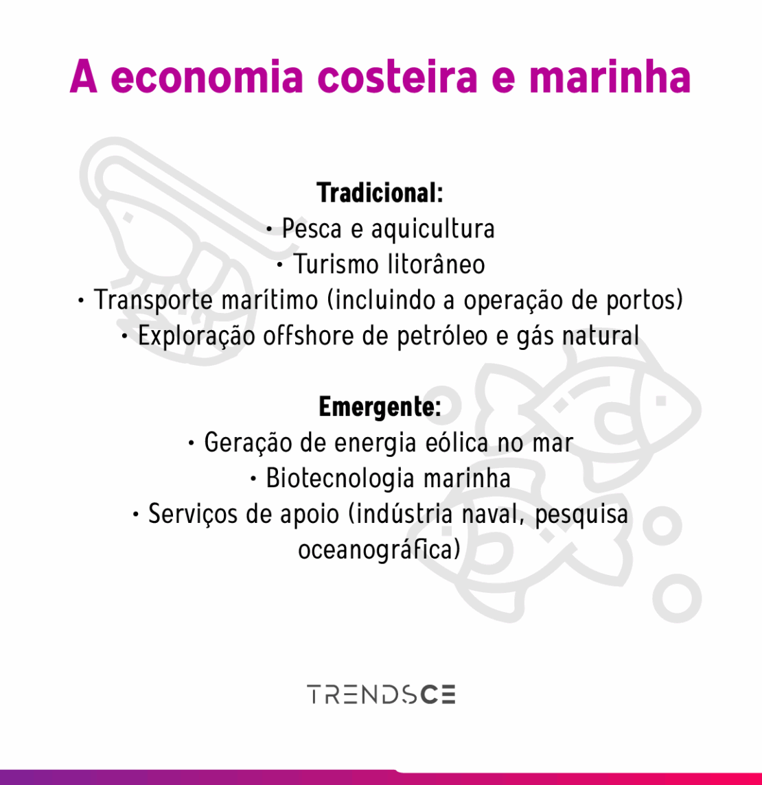 O Ceará sempre teve suas atividades ligadas ao mar, a começar pela pesca, mas não se limita à atividade pesqueira. Ventos que proporcionam esportes náuticos e energia, além de petróleo e gás são outras riquezas cearenses que consolidam ainda mais a importância da economia do mar.