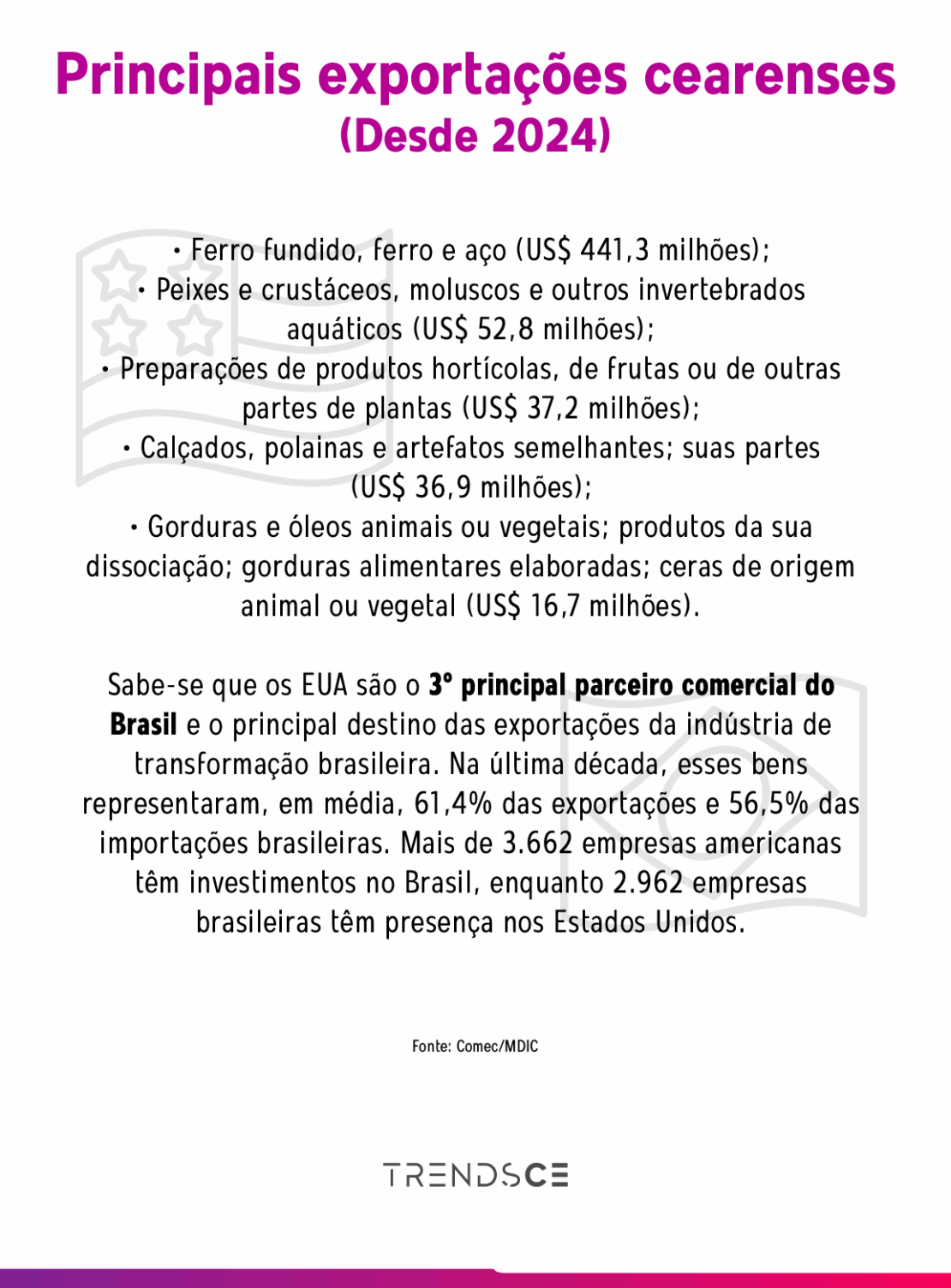 Gleisner espera que as divergências entre Brasil e Estados Unidos se restrinjam ao fluxo comercial porque uma forte guinada geopolítica pode trazer riscos desnecessários. Ele lamenta as manifestações hostis de algumas autoridades em contraposição à busca de negociação de outras sob o argumento de que o fluxo comercial entre os dois países tem sido mutuamente benéfico. O executivo também condena retaliações que piorariam o cenário com prejuízos maiores ao Brasil.