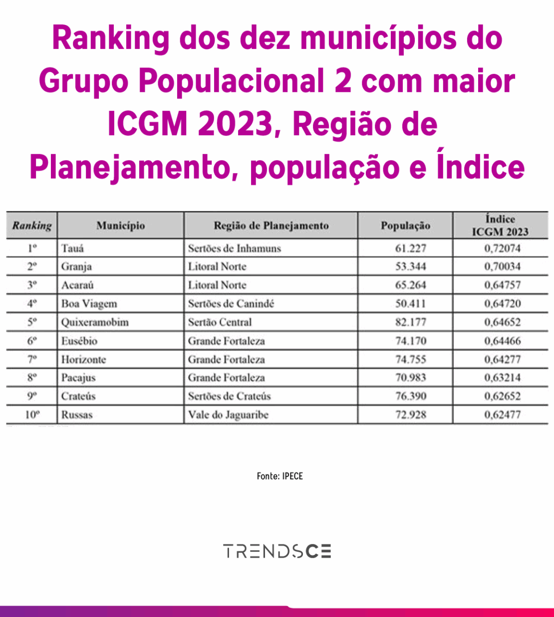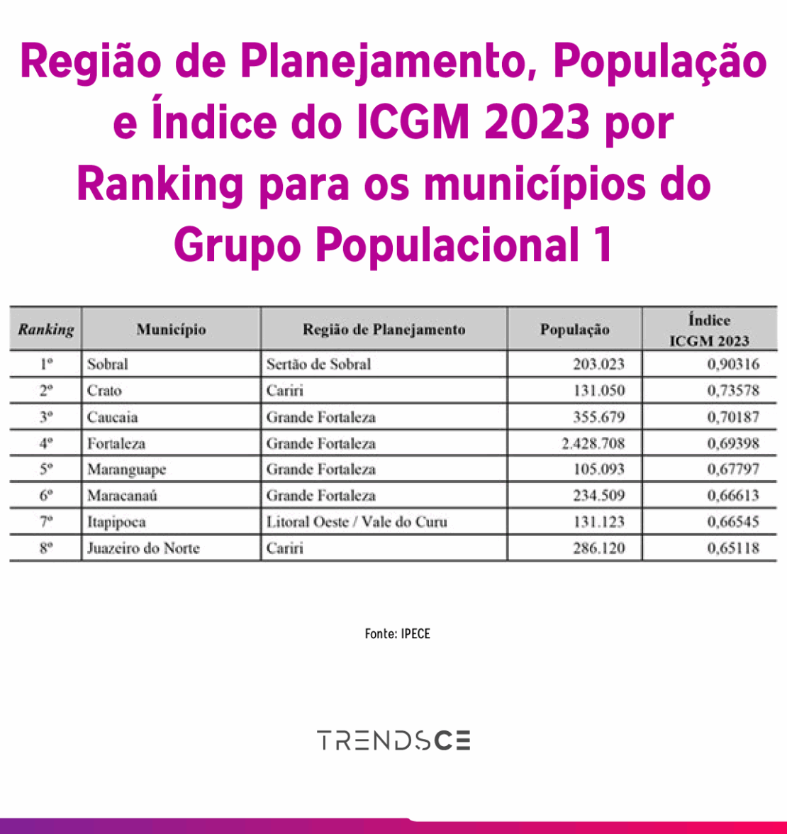 O levantamento separa as cidades em quatro grupos populacionais. Sobral, Crato, Caucaia, Fortaleza e Maranguape lideram o GP01, formado por municípios com mais de 100 mil habitantes.