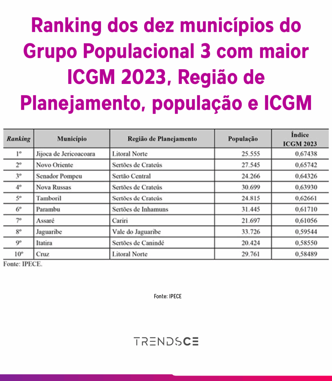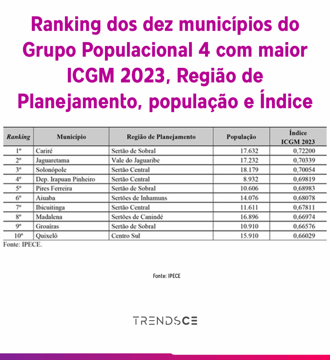 Já no GP04, com municípios de até 20 mil habitantes, Cariré, Jaguaretama, Solonópoles, Deputado Irapuan Pinheiro e Pires Ferreira figuram no topo do ranking.
