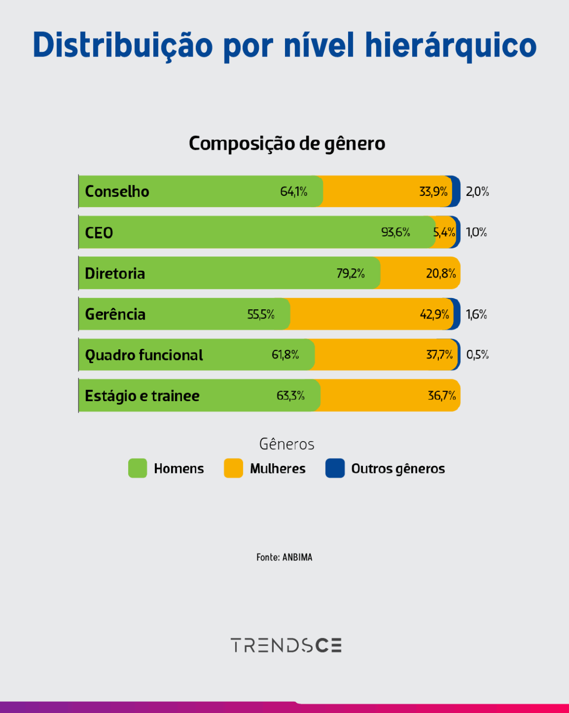 Na análise efetuada pela entidade, o grau hierárquico mostra que na ocupação de cargos de gerência, as mulheres se situam próximas ao equilíbrio de gênero, contabilizando neste critério, 55,5% de homens e 42,9%, mulheres. No que refere ao ângulo de posições de CEOs, a abordagem apresenta relevância baixa, com 5,4% de mulheres no cargo. A pesquisa foi realizada com 154 instituições associadas ao órgão coletor dos dados.