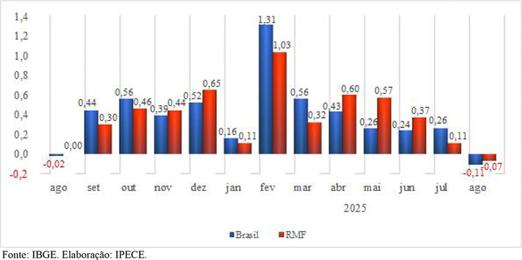 Além disso, o Índice Nacional de Preços ao Consumidor (INPC), que incide sobre famílias com renda de 1 a 5 salários-mínimos, caiu -0,12% na RMF, contra 0,10% de julho; no acumulado de 12 meses, marcou 5,02%. No Brasil, em agosto, o INPC ficou em -0,21%, acumulando 5,05% em um ano.
