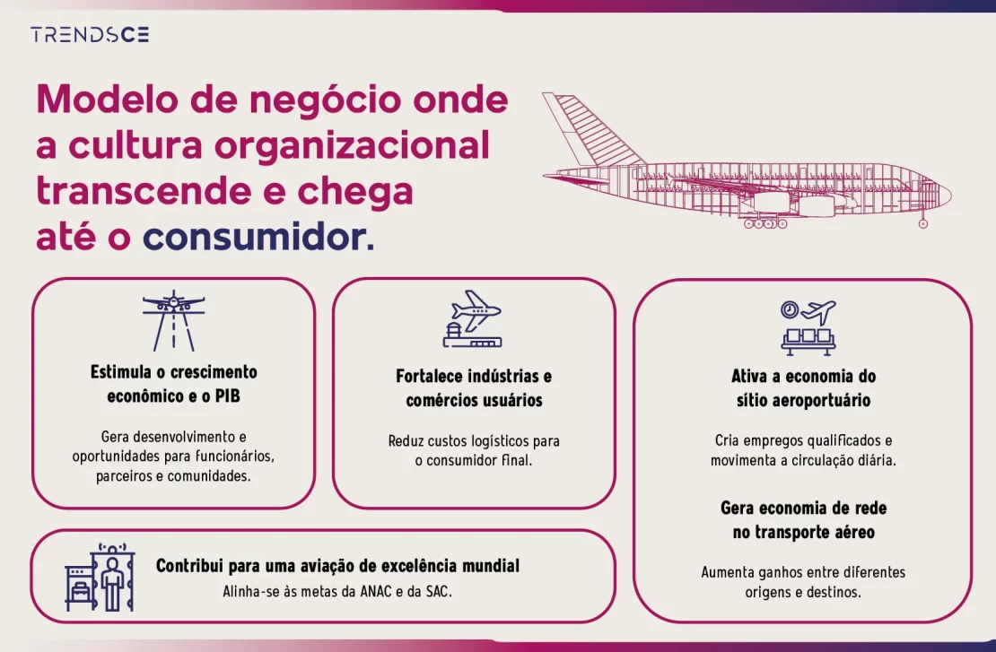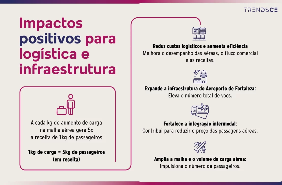 O Aeroporto de Fortaleza, por meio do projeto da Aerotrópolis, consolida-se como polo logístico fundamental para integração dos modais aéreo, rodoviário e marítimo, potencializando a eficiência logística do estado e a competitividade dos produtos cearenses.