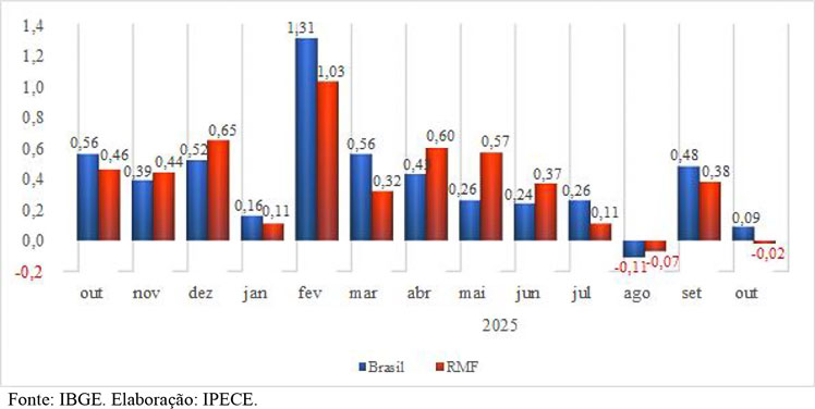 O Índice Nacional de Preços ao Consumidor Amplo (IPCA) da Região Metropolitana de Fortaleza (RMF) registrou deflação de 0,02% em outubro, após a alta de 0,38% em setembro. O resultado, divulgado pelo Instituto de Pesquisa e Estratégia Econômica do Ceará (Ipece), mostra que a inflação acumulada no ano chegou a 3,46%, enquanto o índice dos últimos 12 meses ficou em 4,59%, próximo ao teto da meta nacional de 4,50%.