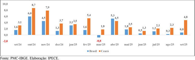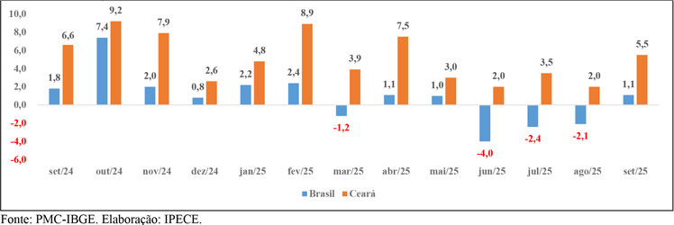 O varejo ampliado do Ceará registrou variações trimestrais de 5,8% no início de 2025, 4,1% no segundo trimestre e 3,6% no terceiro, sempre comparadas aos mesmos intervalos de 2024.