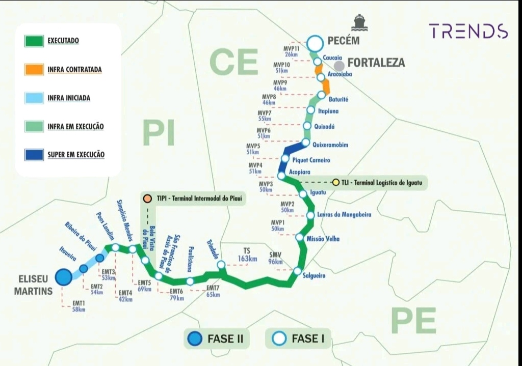 Dados da Secretaria do Desenvolvimento Econômico do Ceará (SDE), apontam que a perspectiva do volume de cargas do Porto do Pecém aumentará numa proporção de 25 milhões de toneladas a 30 milhões de toneladas ao ano, com a ferrovia em funcionamento. Os estudos da SDE relatam que a previsão é que 104 vagões farão o transporte das mercadorias, no percurso dos polos de Eliseu Martins ao Complexo do Pecém.