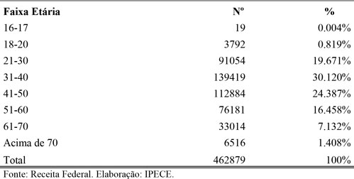 A análise por faixa etária mostra que indivíduos entre 31 e 40 anos compõem a maior parcela dos MEIs no Ceará, com 30,12% das inscrições, seguidos pelos grupos de 41 a 50 anos (24,39%) e de 21 a 30 anos (19,67%). Um estudo do Instituto Brasileiro de Geografia e Estatística (IBGE) de 2023 aponta que, entre os MEIs formalizados em 2014, apenas 51,6% permaneciam ativos após cinco anos, além de evidenciar que quanto mais jovem o empreendedor individual, menores tendem a ser as chances de sobrevivência do empreendimento.