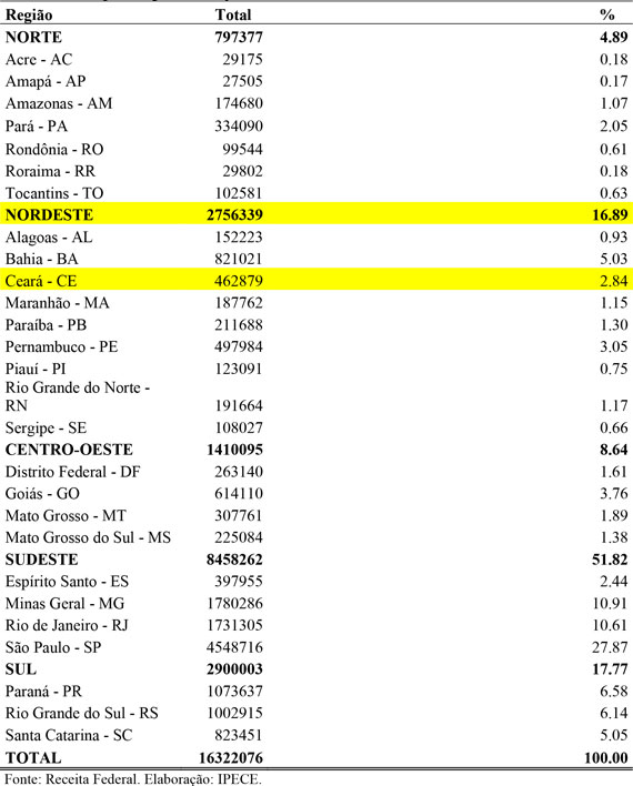 O Ceará possui 462,8 mil microempreendedores individuais (MEIs) registrados em janeiro de 2026, o que representa 2,84% dos 16,3 milhões de MEIs do Brasil. No contexto nordestino, o estado ocupa a terceira posição entre os 2,7 milhões de registros da região, ficando atrás da Bahia (821,02 mil) e de Pernambuco (497,9 mil). No ranking nacional, que inclui os 26 estados e o Distrito Federal, o Ceará aparece em 10º lugar, enquanto São Paulo lidera com 27,87% do total nacional.