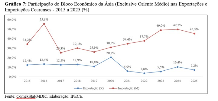 A participação conjunta desses três países no total da pauta de importações cearenses atingiu 55,3% em 2025. A China participou com 32,2% das importações totais cearenses, com 71,0% das importações cearenses vindas do bloco asiático e com 1,24% das importações nacionais vindas desse país.